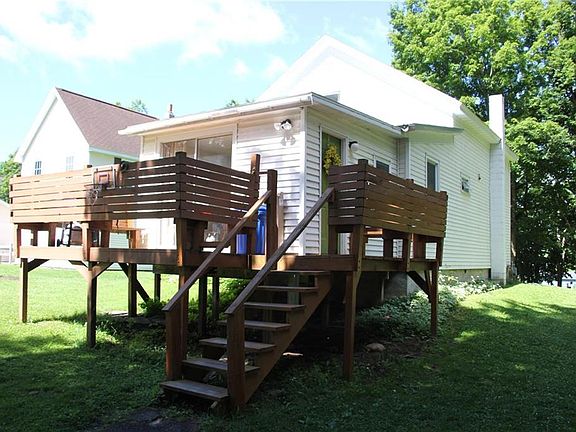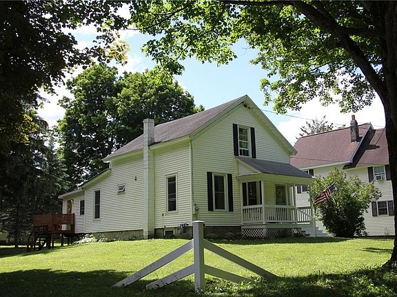 Lovely home on a nice corner property with sidewalk into the village and tree lined front yard. Sunny dining room area with a deck off the back. Country kitchen with morning sunlight! First floor laundry. First floor bedroom and full bath and two bedrooms upstairs. Detached one car garage. Nice neighborhood street. Family room into open living room provides separation if desired or entertaining space. Covered front porch entry.