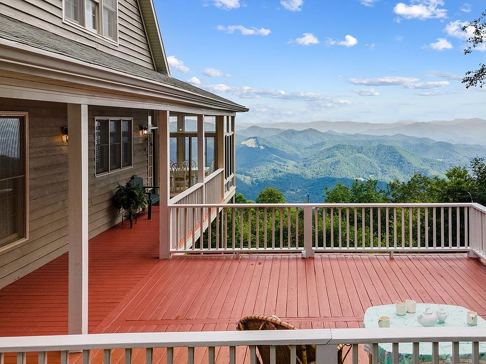 This south facing beauty joins mountain top serenity and a Southern Living floor plan at over 4600 feet in elevation among the Great Smoky Mountains! Enjoy the endless postcard vistas from inside through custom windows or step outside on your spacious deck serving breathtaking mountain range views where you'll relax with the cooler temperatures in grand style. Pine hardwood flooring spans the main level along with a natural stone wood burning fireplace. This prize has a few bonus rooms and spaces such as a billiards room that also functions as a library, a fitness and wellness room with a spacious jacuzzi tub. Views of the Smokies continue into the shop/hobby room and the office/studio room. At your hideaway retreat you'll have hiking at your doorstep. Schedule your showing today!