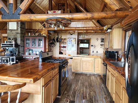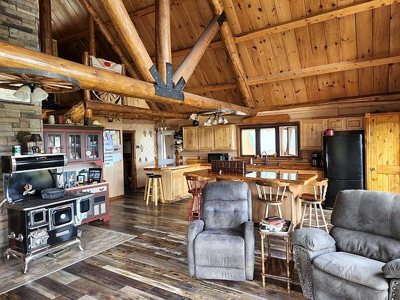 'Big Sky' in Northern Maine! Offered is an 'off the grid' working horse ranch with capacity to boarder 30+ horses along with great grazing pastures for Cattle or other livestock. The log home features a custom design, finished walkout basement, 3 bedrooms, 2 full baths, huge family and living-rooms, custom wood slab counter tops & Hickory cabinet, Cathedral ceiling & open loft. Enjoy a 12 mile view of Cross Lake and more from the living room and deck. Out building include an oversized barn with, tack room, work shop, stalls and hay storage above. Another barn is onsite for round bail hay storage along with other outbuildings and a rustic small cabin. The 33+/- acre lot feature a nice blend of pastures and mixed woods which has been maintained with an active forestry plan. Here is your dream horse property or secluded off the grid home. A unique, one of a kind dream property!