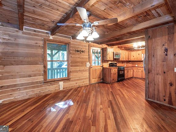 New Price! Mountain Cabin on 2.3 Acres with VIEWS! Bring your improvement skills and make this property into a showplace. Tucked away on 2.3 wooded acres, this MOVE IN READY 3 bedroom (3rd is loft bedroom), 3 bath Log Cabin is located in the gated community of Burnt Mountain Estates. Authentic log walls, open floor plan, wood floors, brand new carpet upstairs and an abundance of natural light, The Main Level features a spacious 2 story great room with a 2018 wood stove, the kitchen with plenty of cabinets and counter space, dining area, and a spacious Bedroom and Full Bath. Walk out onto the huge screened porch which connects to the covered from porch, perfect for relaxing and enjoying the MOUNTAIN VIEWS. Stay cozy year-round with a newer wood stove AND central heat. Upstairs, a large loft with closet area offers the 3rd bedroom or an office or reading nook, along with the Second bedroom and Full bath. The full basement is a rare find in a cabin, complete with a finished full bath plus a 4th Bedroom to be finished and plenty of room to use as a workshop, storage, or future living area.Seller's improvements during their ownership make this home move-in ready-just bring your vision and love for mountain living. Whether you're looking for a primary home or weekend retreat, this one checks all the boxes. ASK TO SEE THE IMPROVEMENTS LIST. Septic system permitted for 2 bedrooms, expansion may be possible if desired. Floor plan is not meant to be relied upon for measurements. Water is from a community well.
