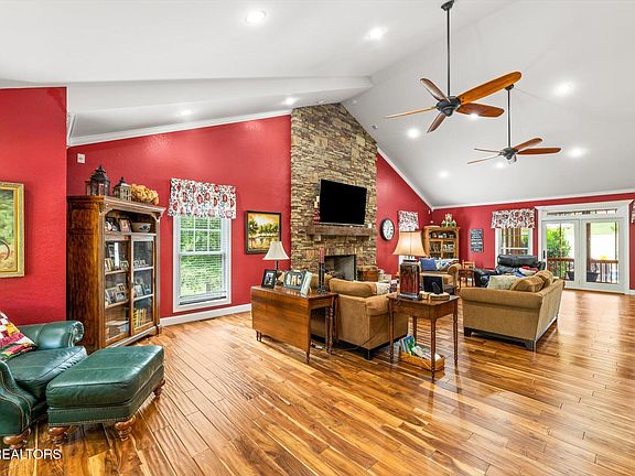 The main level invites you in with cathedral ceilings, a cozy stone fireplace with gas logs, and Brazilian teakwood flooring that flows throughout the living areas. The gourmet kitchen is a true centerpiece, featuring custom maple cabinetry, high-end KitchenAid appliances, beverage cooler, luxury range vent, and stunning Corian® Quartz countertops. These countertops are not only beautiful but also durable, stain-resistant, and low-maintenance—perfect for everyday meals or large gatherings. A formal dining room, bright office, and spacious laundry/utility room with sink and built-ins add to the functionality of this level. The 2-car garage on the main level provides everyday convenience.