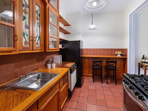 Privately accessed on the ground level, the apartment has a large front bedroom, a generous sized kitchen, and sunken living room just off the garden. In addition, there is a second bedroom that could be used as an office, plus a full bath off the entry foyer. The rear garden has a large private patio, perfect for al fresco dining.