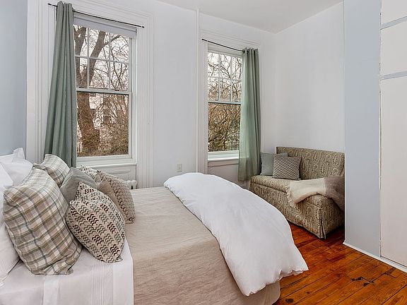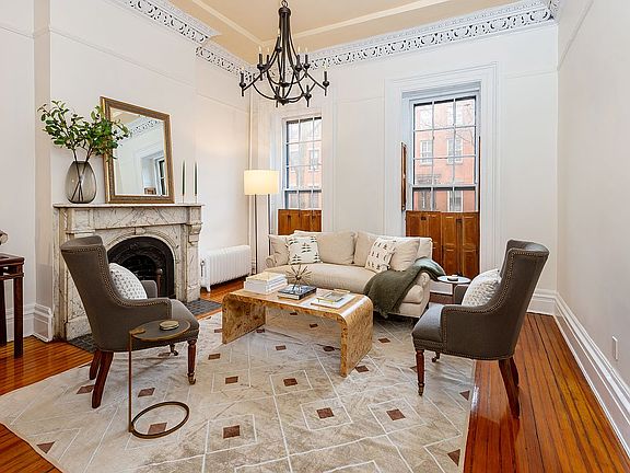 The living/dining room of the top floor apartment stretches the full width of the brownstone. It includes a wall of south facing windows overlooking the rear brownstone gardens and a skylight, creating an enviable sundrenched entertaining space. A recently renovated bath and skylit kitchen form the center of the apartment. The large front bedroom includes a fireplace and access to the secondary bedroom/office.