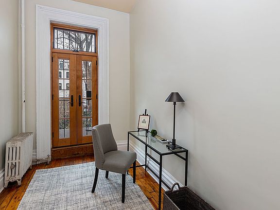 The parlor floor has 11' ceilings and is arranged as a one bed/one bath apartment, with an office leading to a private deck and access to the rear garden. The nicely proportioned the living room, with its original marble mantle, 9' windows, ornate plaster cornice, is loaded with charm. A large kitchen and an abundance of closets make this highly desirable space.
