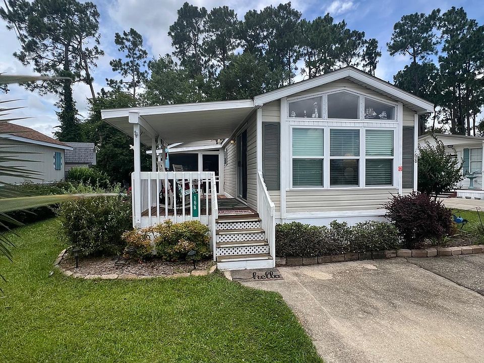 Quaint Coastal Home with backyard nestled into a private, wooded green space. This 786 Sq Ft, 2 bed/2 bath home had an addition added in 2014, with a primary bedroom and en-suite including a double vanity, walk in shower and laundry closet. Notable features include: Two water heaters including a New tankless water heater in the primary bath, New front windows in 2023, New vinyl floors in 2024, Hardy board skirting, new HVAC in 2017 (serviced twice a year), new roof with the addition was in 2014, and storage area under the house. This property is in the highly desired, safe, pet friendly, beach neighborhood of Spanish Cove, a coastal paradise gracing the shores of Perdido Bay, just 5 minutes from the Lillian boat launch and only 15 minutes from the sugar white beaches of the Gulf of Mexico. There is something for everyone in this coastal golf cart community that sits on the Alabama/Florida line. Owners enjoy membership with a lifestyle full of amenities and remarkably affordable POA Dues of only $74/Mo (dues paid quarterly) and includes trash pick-up, 24 hour security, and key FOB entry into all facilities. Don't miss out on the opportunity to make this bright and airy retreat your own and live the beach life. Buyer to verify all information during due diligence.