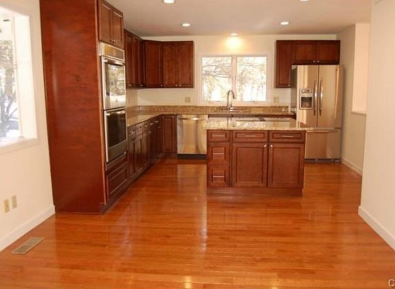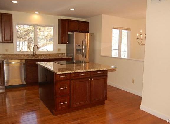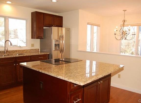 Spacious townhouse open floor plan. Completely updated! Tall ceilings throughout. New kitchen, granite counter tops, new stainless steel appliances, wood floor. Living rm/fireplace. Dining rm, family rm, ceiling fan, sliders to back yard. Exceptional size master bedroom, WIC, private bath new in 2014. Two additl bedrooms share bath. Finished lower level 4th bedroom, full bath, playroom. Generator transfer panel -2012. Sprinkler system installed in 2011. Exterior painted 2006, Basement heating a/c & sump pump system 2007. Freshly painted 2013, new carpets upper level and 1st flr bath updated 2013. Upstairs windows replaced 2006, New roof 2010. Walk to town. A commuters dream!