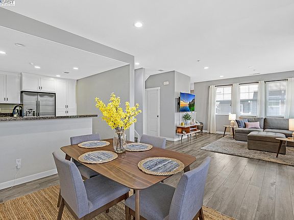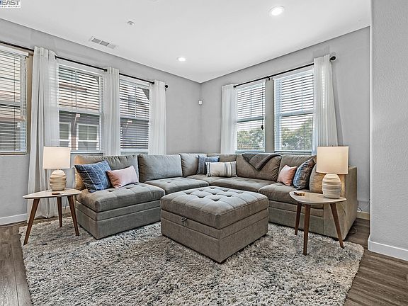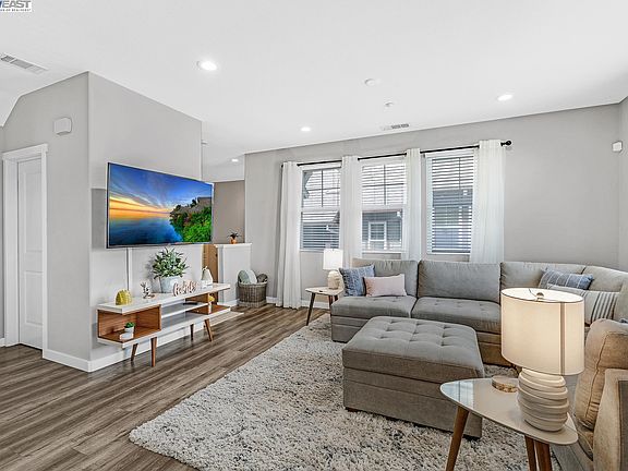 Location, Location, Location. Beautiful end unit townhome/condo with trees and privacy plus a balcony for your relaxation! The interior has amazing design trends such as luxury plank flooring,tile plank flooring, white cabinets and neutral paint, the main living area features a family room, an eating area with a shiplap accent wall, canned lighting throughout and stainless steel appliances. The lower level features a bedroom, full bath, walk in closet. The upper level which has a primary bedroom and bath, plus a guest room and bath and the laundry area. The washer, dryer, refrigerator and TV in the primary bedroom and family room stay. Wood blinds throughout, upgraded lighting and so much more. PLUS walk to downtown Livermore!