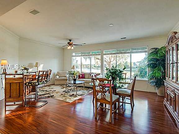 One of the most gorgeous views in all of Sun City. Adorned with huge Live Oaks, dripping with Spanish Moss+Lagoon views make this home one of a kind. Del Webb Rainier with Hardiplank exterior & new Wood Floors in Living Rm. Featuring 2BR + Den/Office w/ built-in cabinets, 2 Full Bths, Corian counters in Kitchen, extended island, dbl ovens, 2 skylights, & Brkfst area. 2 bay windows in Master & Guest Bdrm make these rooms even larger. Fam Rm w/sliders leading to screened lanai. Includes an oversized 2 car garage. Enjoy your evening cocktail from the patio while overlooking sweeping lagoon views! (909113)