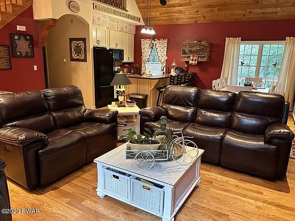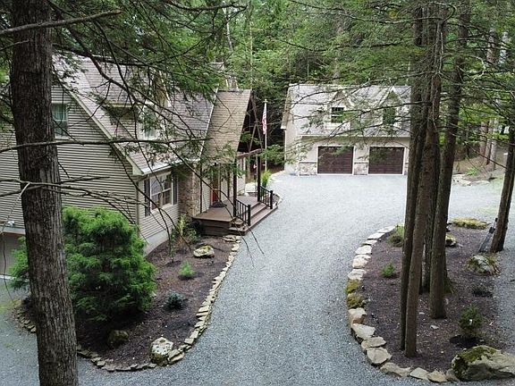 Charming Custom-built home by Clemleddy in 2005 in desirable Millbrook Community! This home is a perfect blend of Craftsmanship and Innovation! 3-bedroom, 3 FULL bath masterpiece including a detached oversized heated 2-car garage (office/work-out area/storage on 2nd floor), 3rd garage attached to home. Includes: Lake Rights on Wallenpaupack (rent slip for $200), Open-concept, C/A, New 1000 gallon Owned Propane Tank (feeds everything/energy efficient), HW Floors, Ceiling Fans, a new Trex Deck on Front and Back, Screened Porch, 1st fl. Laundry, new 22Kw Generac, Bath on Each Floor, Master Suite, FP insert, Vaulted Ceilings, finished LL has Theater, LL Office could be 4th BR, circular driveway, a cozy bunkhouse by the fire pit! Too many unique features to list!, It's an Entertainer's Dream!, Eating Area: Dining Area