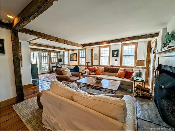 This 3.5 bedroom 1790s farmhouse is a quiet, rural property along a quiet, historic scenic road. It has original beamed ceilings throughout, with a living room centered on a stone hearth including a bread oven and iron details. The house opens onto two lawns and a stone patio, with new outdoor grill. Across one lawn is a vegetable garden, and beyond the back stone wall is a wildflower meander through a field on the property. All rooms are furnished with antiques. Each 2 bedrooms have a full bed, one bedroom has a queen bed and there is an additional single bed in an entertainment room. The main bedroom suite with a queen bed has an adjoining office/tv screen room, and a marble glass shower with Waterworks sink and fixtures. The kitchen has a professional stove, farmhouse sink and soapstone counters. The generous Pool house is nicely furnished and great for entertaining your guests or just enjoying the peace, quiet and privacy. The heated, in-ground pool area is separate from the house and completely private, landscaped with exotic trees, and ancient stone walls, and the pool is furnished with teak steamer lounge chairs.