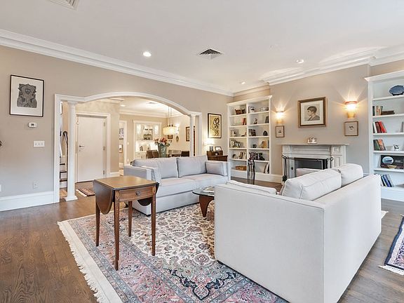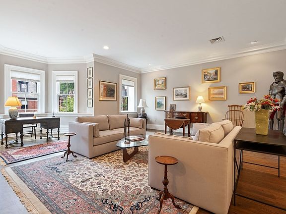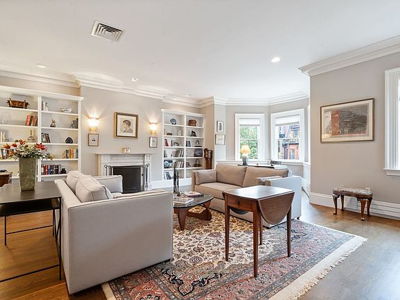 Set in the heart of Back Bay, this exquisite direct-access elevator penthouse duplex with private terrace and parking offers the finest standard of living on Boston's most coveted street. Entry to grand arched-entry living room with soaring ceilings and center fireplace surrounded by custom built-ins. Perimeter moldings extend from oversized bow front windows across entire living level, with gleaming hardwood floors throughout. Living room flows to formal dining area opposite half bath, perfect for entertaining. Granite and stainless steel chef's kitchen/family room with center island and breakfast bar, with additional fireplace and wall of custom storage. Large master suite upstairs, with elegant en-suite bath and two walk-in closets. Walkout on this level to stunning private terrace with sweeping views and built-in irrigation system. Large second bedroom also with en-suite bath. Central A/C, private on-site storage, and direct-access deeded parking included. A true masterpiece!