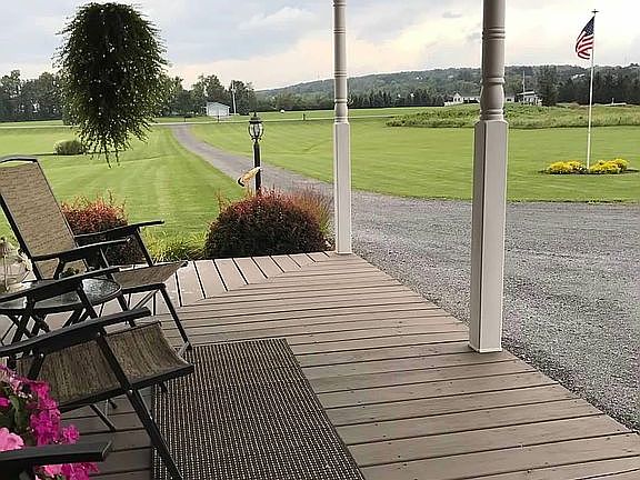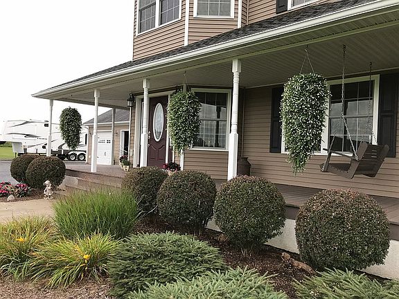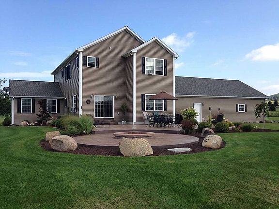 4 bedroom 3.5 bath house in country setting with 3 car garage located just outside the village of Dryden at 168 McClintock Rd. With 3800 sq/ft of finished space and 740 sq/ft unfinished space this 2 story house was built in 2008 and has been kept in pristine condition. This home sits on 8.3 acres. Kitchen, breakfast area, and sitting room are in an open concept area. There is a formal dining room and a formal living room. There is a large family room area in the basement with a 3/4 bath and mini kitchen. Front entry is 2 story with hardwood stairs leading to the second floor. Master suite includes large bathroom and walk in closet. Wrap around front porch. Large stamped concrete patio in the back with fire pit area. Garage is 28’x48’ (heated) with shelving on one end and 32’ of metal cabinets/workbench on the back wall. Also has concrete stairs from the garage down into the storage area of the basement. High efficiency propane boiler for heat and hot water. There is also an outdoor wood boiler in a 20’x20’ wood shed/pavilion that is currently in use instead of the propane boiler. This wood stove heats the house, garage, and hot water. Can be removed if you have no interest in burning wood. There is a large parking area in front of and beside the garage with a 30 amp plug in for an RV.