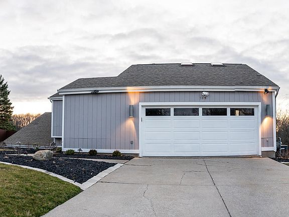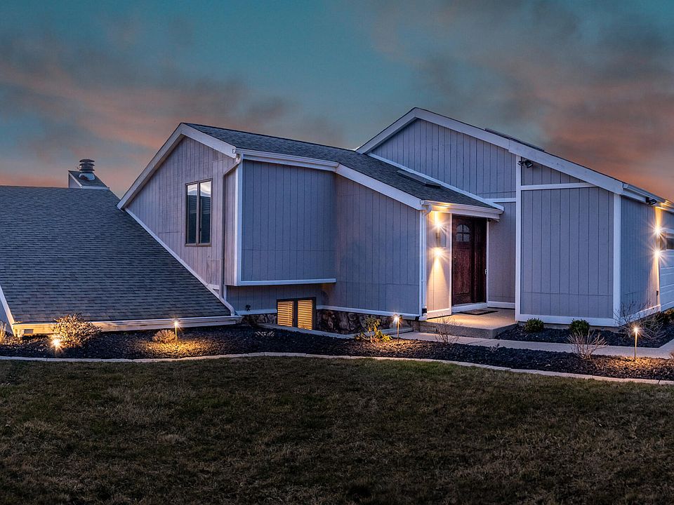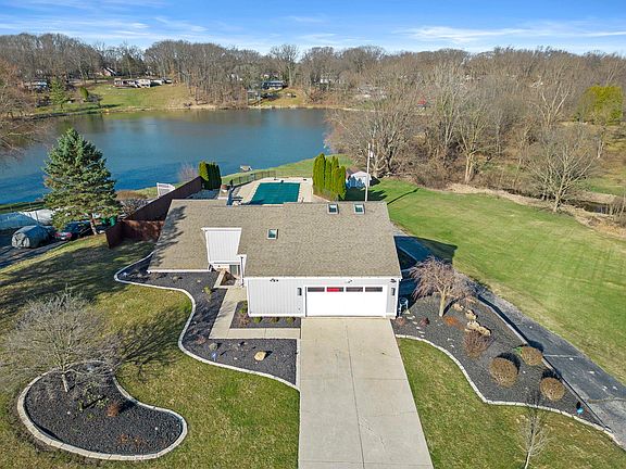 Your very own at home oasis awaits in this marvelous contemporary styled home with up to 4 bedrooms and 2 1/2 bathrooms! 2+ Acres on over 70 ft of lake frontage to enjoy or view while in the comfort of your elegantly landscaped heated inground pool. Vaulted ceilings, an abundance of natural light, and open concept rooms invite entertainment as well as plenty of space to indulge in life. Granite counters and beautiful wood cabinets make cooking a joy. His and hers walk in closets along with an upgraded ensuite complete the main floor. The upper level consists of two more bedrooms connected by a jack and jill bathroom plus a bonus bedroom/loft rec space with skylights. All bedrooms have been upgraded with built in California closets. Top it off with a walk out basement, many more upgrades, and a perfect location, this home has everything you are looking for.