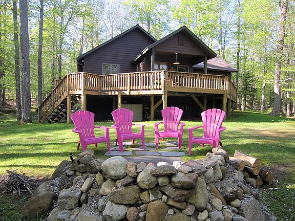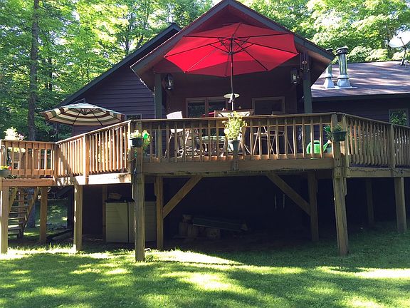 A MUST SEE TO CAPTURE THIS BEAUTIFUL SETTING - Prime location with 3.7 acres near McCauley Mtn, Nicks Lake, hiking, and snowmobile trails. Year round 3 BR (1 master suite), 2 full bath home is very inviting. Living room features wood burning fireplace and vaulted ceiling. Heated 2 car garage, family room, laundry, and storage in basement. Additional amenities include fire pit and partially covered deck.