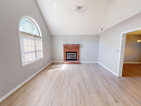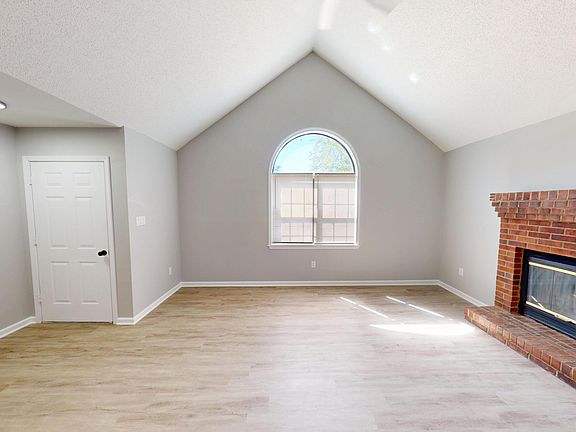 Open-concept livingVaulted ceilingsLight-toned flooringArched windowCharming brick fireplace