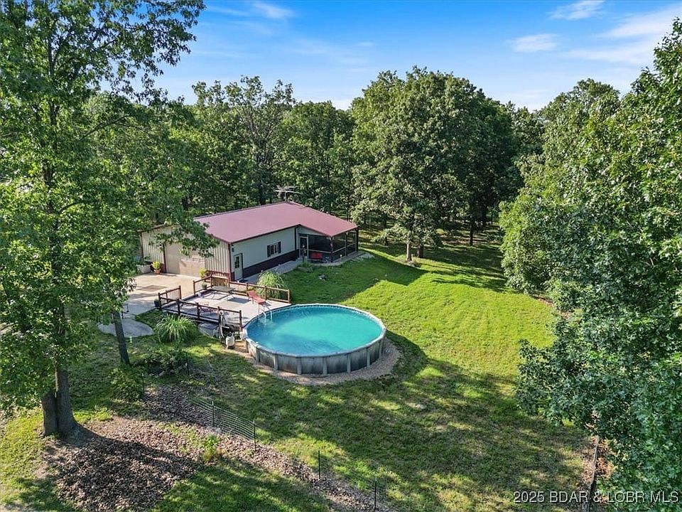 PRICE REDUCTION!!! Discover the perfect blend of privacy and convenience with this 1,500 sq ft shouse on 10 serene, park-like acres with NO HOA. This 1 bed, 2 bath home features a studio-style layout that can be used entirely as living space or partially as a garageendless potential to make it your own! Inside, features custom cabinets, tongue-and-groove siding, and a huge walk in closet! Best of both worlds with a covered, screened patio to relax and an open composite deck next to the pool for entertaining. The metal siding and roof mean virtually no maintenance and the oversized detached 2-car garage with electric is perfect for storage or a workshop. There's even a 30-amp camper hookup with a septic tie-in, making it ready for guests or RV stays. The land is a great mix of open and timbered areas, already featuring a few started trails and tons of wildlife. Whether you're looking for a peaceful getaway, full-time residence, or a place to expand, this property has the space, layout, and flexibility to make it happen. Camdenton school district and easily get to Sunrise or Camdenton! 2025-08-12