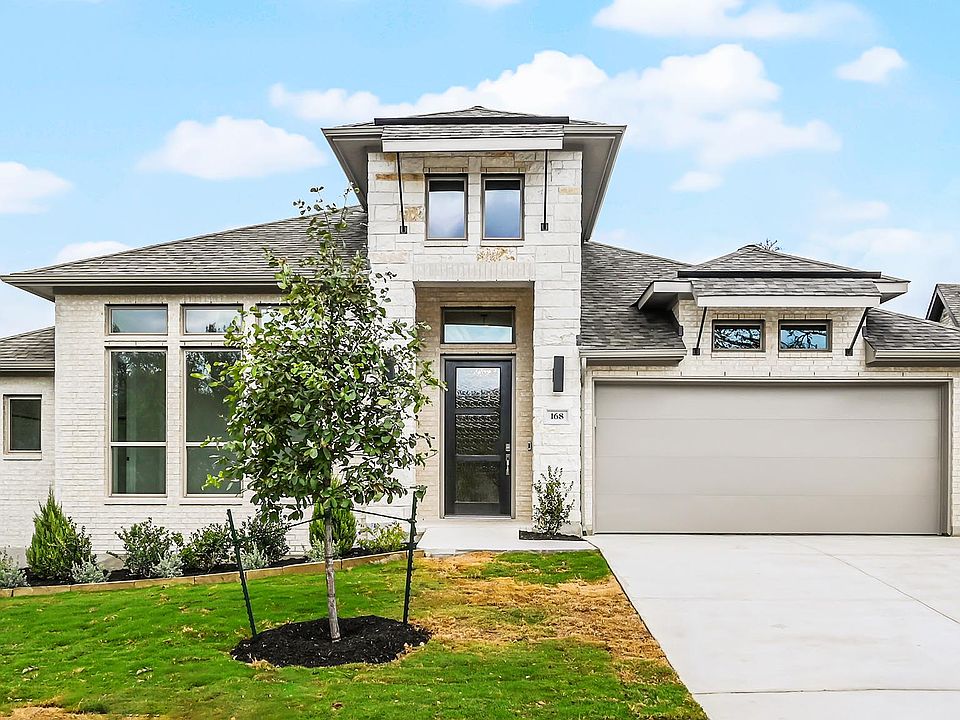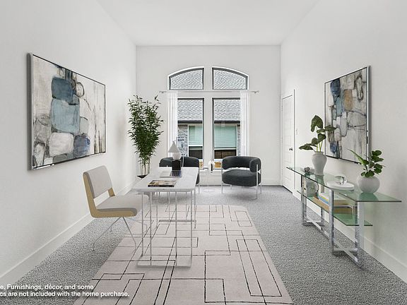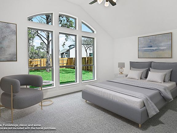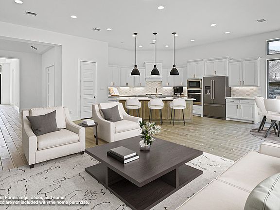 Extended entry leads to open family room, kitchen and dining area with 12-foot ceilings throughout. Kitchen features generous island with built-in seating space and 5-burner gas cooktop. Family room features a wood mantel fireplace and sliding glass door. Primary bedroom features 12-foot ceiling and wall of windows. Dual vanities, garden tub, separate glass-enclosed shower and two walk-in closets in primary bath. A game room and guest suite with private bath add to this spacious four-bedroom home. Extended covered backyard patio. Mud room off three-car garage. Representative Images. Features and specifications may vary by community.