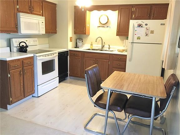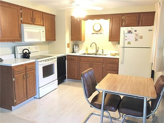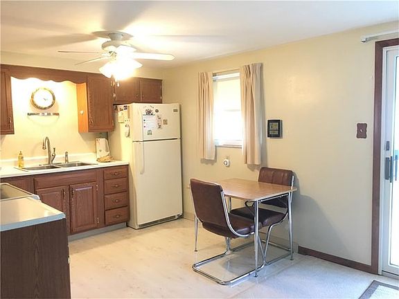 Spilt Entry, corner lot with part fenced area, Kitchen, dining room with sliding doors to patio with awning, fenced area, living room, 3 bedrooms, full bath and half bath in basement, finished family room in basement, separate laundry room basement, one car integral garage, walkout basement. (electric stove however a gas hook up is in place)