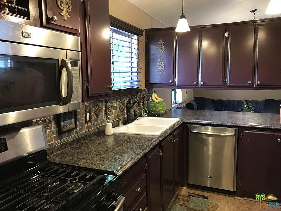Excellent location on this 2+ bedroom (one bedroom is very long and could easily be divided into two), 2 bath home. Formal dining room, large vaulted living room, desirable split floorplan giving large master bedroom the whole one end of the house. So many decorator touches, from the stack glass in the master bath, to the decorator color paint, the artistic treatment of the tile backsplash over the beveled edge countertops, with delightful additions of tin squares, and feature tiles. Separate large bright laundry room. Dynamite front door with pewter look security door, and stunning, rich wood tone floors. Carport is double wide and extra tall to accommodate your full size truck or camper, across the street from parklike property, close to the second pool area in this park. Quiet and majestic cul-de-sac setting, surrounded by mature trees and mountains so close you can nearly touch them. All age park offers all the amenities. Owner will carry w/$40,000 down, 6%, 3 years.