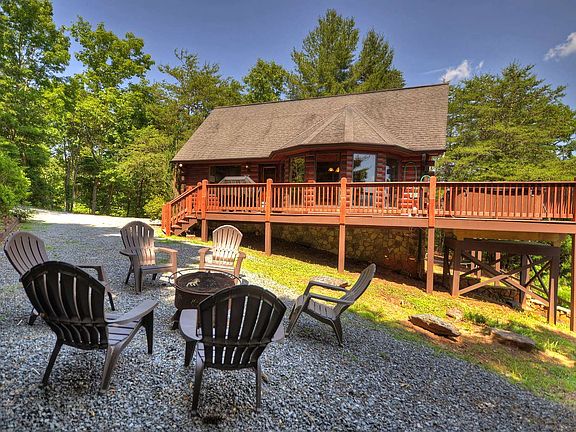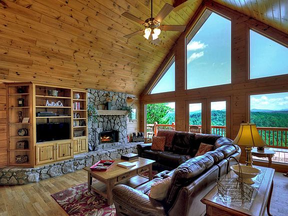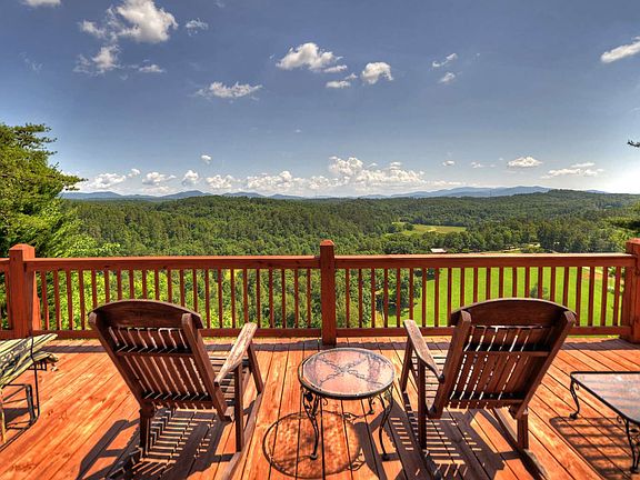 Spectacular Long Range & Pasture Views from this Chalet Style Rustic Retreat! Enjoy the Dramatic View from Floor to Cathedral Ceiling Wall of Windows, Plus Glass Walls Encasing Ample Sized Dining Area, Spacious Great Room with Stone - Wood Burning Fireplace, High End Pella Doors and Windows, Main Floor Master Suite with Corner Fireplace and Custom Walk in Tile Shower/Double Vanity/Jetted Tub, Laundry and Guest Bath also on Main Level, Loft Area for Additional Sleeping if Needed, Terrace Level Bedroom w/Corner Fireplace Plus Den that could be Converted to Bedroom all Opening out to Stamped Concrete Patio. Great Privately Situated Location in Upscale Paved Road Mountain Community within minutes of Downtown Blue Ridge and Lake Blue Ridge! Very Successful Rental History. Furnishings included.