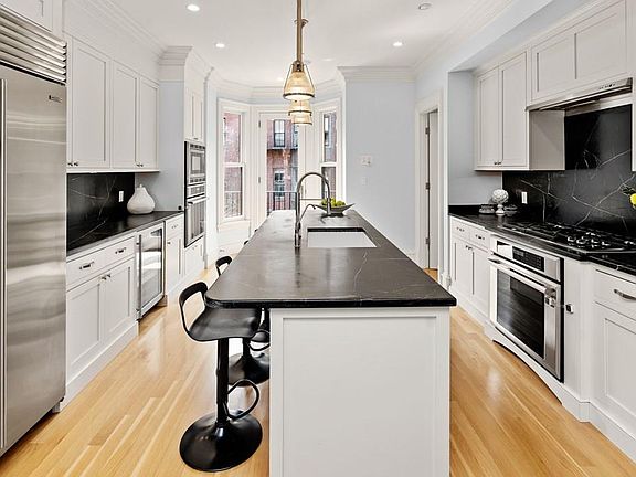 Located on one of the most sought after streets in the South End, this parlor triplex was one of two homes which were fully gut renovated by noted developer Mainsail Management. With three bedrooms and two living spaces situated across three floors, this makes urban living easy and accessible on a leafy and wide street. The parlor features a striking kitchen with soapstone counters and custom white shaker cabinets. Uncommon extras like double ovens, a large pantry with beverage chillers and beautiful millwork make this space stand out. The living, kitchen, dining and deck space are all open to one another allowing for a graceful space. The master bedroom offers two closets and an impressive marble bathroom with a custom double vanity and large glass enclosed double shower. The second and third bedrooms are also spacious with windows and lots of furniture layout options. There is a third full bath on the garden floor which is close to the second living / family area. Patio + dir parking