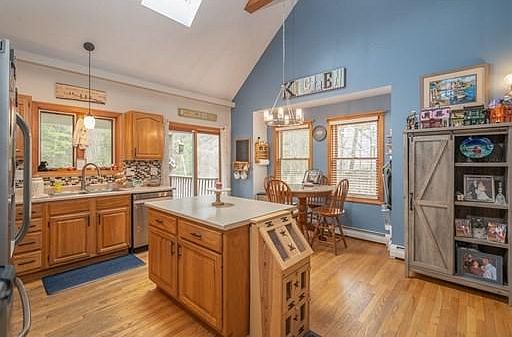 Move right into this absolutely charming home. Walk in off the front porch into soaring ceilings with a wide open floor, featuring hardwood floors a kitchen island, pellet stove and dining area. Head out to the back deck to the 1.76 acres that backs up to the Conant Dam or the fully enclosed 3 season porch and enjoy the peaceful and private views. An enormous 1st floor bedroom, also with soaring ceilings and it's own private entrance, along with a full hall bath, office area and second bedroom there's tons of space! Up the stairs with its own little balcony area overlooking the living room is the true master suite. With a fantastic soaking tub, tile shower, walk-in closet, and private outdoor balcony. Heading into the basement is a comfortable laundry area, and even more finished space. With a large bonus room/play room (currently being used as an office) and a cute as can be mudroom off the 2 garage this house has it all!