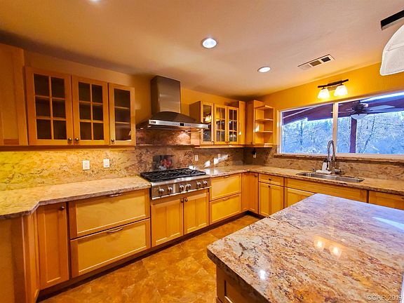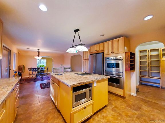 Incredible hill-top estate in beautiful Mountain Ranch, in the heart of Calaveras County, with panoramic views of Rimrock Peaks and beyond. This property has it all; in addition to a great quality home with updated kitchen and bathrooms, there is an in-ground pool with a cover and a 2-car carport. The large barn/garage/work shop, which has newer fire retardant Hardie plank siding, also has In-Law Quarters with a full bathroom. There are two covered parking areas on both sides of the barn, a large greenhouse behind, in addition to storage sheds, a chicken coop, and multiple fenced in garden areas with drip irrigation. There is also a covered RV Parking Structure towards the front of the property. This home was rebuilt from the studs up just over 10 years ago, including all new plumbing and electrical, new double pane windows and doors, ceramic tile flooring throughout, solid core pine doors and new Stucco on the exterior of the home. The living room has a custom fireplace with built-in cabinetry and a high-end surround sound system. The gourmet kitchen has Birch cabinetry, granite slab counters and backsplash, a large island with a Jenn Air cooktop and a prep sink, a six burner GE Monogram cooktop and double-oven, a refrigerator (included) a microwave and dishwasher. The adjacent office has a small library and there is a mud room with a large pantry. The guest bathroom has a pedestal sink and a granite shower/tub combo. The master bath has a custom marble and glass block shower, a custom vanity with a matching marble countertop and double glass vessel sinks. The home also features art niches in the hallway and custom lighting inside and out. There is also an electrical hookup for a generator. With an acceptable offer, the sellers will include the portable generator, a John Deere tractor, a golf cart and the surround sound system.