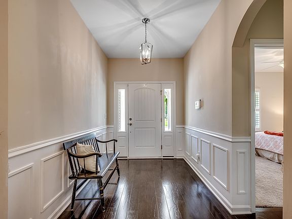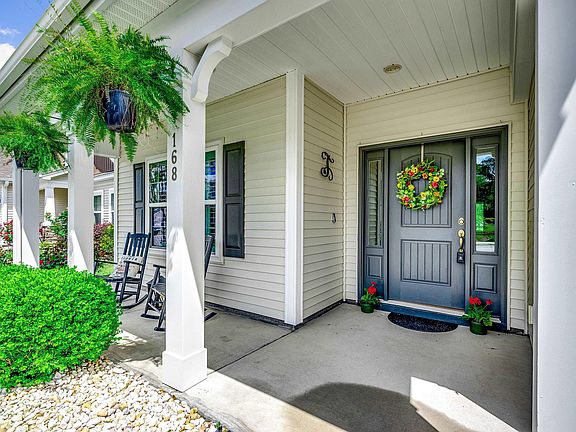 PRESTIGIOUS single-story home with lovely Carolina Room overlooking the entire length of the pond! Lots of character throughout with rich dark engineered wood floors! Arches lead into the open living area with an eat-in kitchen area and bar, all in the open space! Perfect for gatherings! Just off this area is the Carolina Room, which has a view to die for! The full length of the pond can be seen, as can the clubhouse and the community fishing pier! The primary suite also shares this pond view from the back of the home and offers a wonderful double sink and large walk-in shower! The split bedroom floor plan offers privacy for guests with 2 bedrooms and a bath at the front of the house. There's also a sweet front porch with another pond view on the front of the home! Home also offers front/side yard irrigation and upgraded landscape features. Amenities galore!! Pool, gym, pickle-ball courts and a grand clubhouse with a full kitchen for gatherings or get-togethers. LOW HOAs AND LAWN MAINTENANCE IS A PLUS FOR THIS COMMUNITY!
