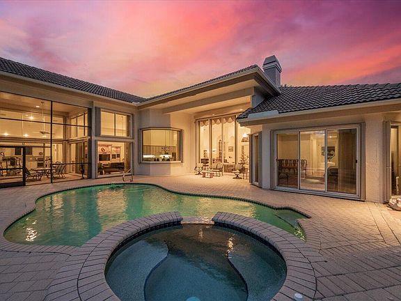 Prime location in beautiful gated community of Breakers West in West Palm Beach! Located on premier cul-de-sac street with stunning water & golf views along the Breakers Rees Jones 11th green. Elegant circular driveway leads to this spacious home with almost 4,800 AC Living Area and 4 BR, Office, 4.5 BA and full 3 car Garage with side entry. New tile roof installed 2016. Impressive Living Room with floor-to-ceiling windows overlooking pool, 16 ft ceilings & marble fireplace. Marble floors in main living areas & wood floors in bedrooms. Lg center island kitchen has 2 sinks, double ovens, granite countertops and pantry closet. An additional catering kitchen for entertaining was added with separate refrig, oven & sink. This flexible space could also be used as an art studio or home gym.