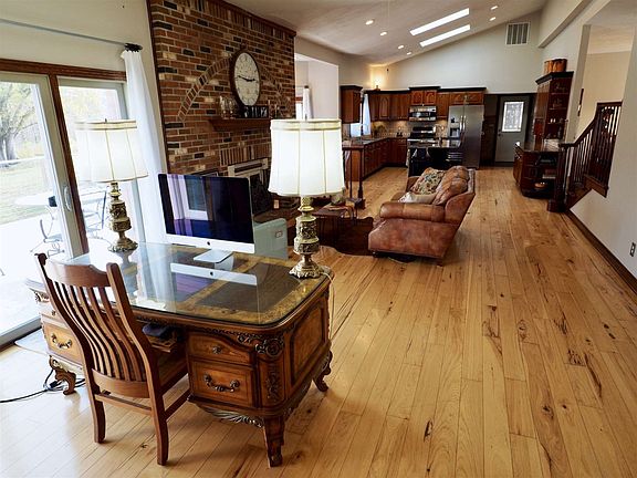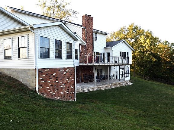 Built with quality & strength, this spacious home with a walkout basement has over 5,000 square feet of living space, overlooks 4.5 country acres with rolling hills, a creek, pond, mature trees, and includes a pole barn. The home features 4 bedrooms plus a den, 5 full baths & a half bath. The main level master bedroom suite has a Sanijet pipeless whirlpool tub, walk-in shower & heated floors covered in natural stone. It also features a large picture window which offers private backyard views, & side door access to the upper deck. There are two kitchens, including one in the lower level. The main kitchen features a large center island w/ bar stool seating, quartz countertops & stainless steel appliances including 2 sinks and 2 dishwashers. Outside the adjacent nook is the large 14 x 27 foot upper deck, perfect for entertaining. The spacious remodeled basement has a natural wood fireplace insert, large glass sliding doors & an entry door to the expansive 14 x 50 foot lower deck. The heated sunroom off the garage provides great views of the backyard & pond. Updated features include a freshly painted 1st floor interior, brand new carpet & pad on the 1st floor, newer easy-care windows throughout, newer garage doors (5 yrs), septic system (9 yrs), roof shingles (9 yrs), pole building roof (7 yrs), and a twin Water Furnace open-loop geothermal system (9 yrs). Other interior features include a reverse osmosis water system, kitchen skylights in a vaulted ceiling, large bay windows in 3 rooms, substantial ¾" engineered hickory hardwood flooring, a spacious walk-in pantry, an additional laundry facility in the lower level, a natural wood fireplace insert in the family room, a main floor den/guest room & loft with full bath, & cable internet. Exterior features include massive, architecturally correct front columns that add flair to this colonial home. The steel & travertine stone upper & lower decks are maintenance-free & provide a spectacular view of the backyard in privacy. Both decks are connected with a commercial-grade spiral staircase. The upper deck is outlined with a modern stainless steel & cable railing system. The gorgeous maintenance-free front porch is covered in durable travertine stone. Substantial double entry doors feature beautiful leaded glass panels. The quarter-acre pond is deep (12 feet), clean, and stocked (bluegill, sunfish & bass). It also comes with a floating raft & a large sandy beach with playground. There is a 4th garage bay in pole barn.