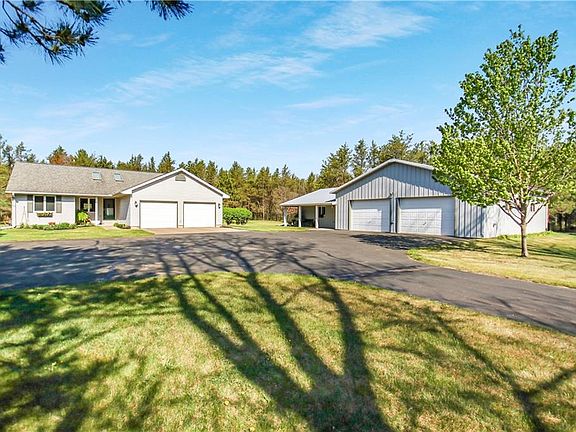 Charming home tucked in 5 beautifully wooded acres. Everything you need on the 1st floor inc laundry. Enjoy natural light pouring thru the skylights of this open concept. Features master suite separate from other BR's. Handcrafted barn door separates the add. BRs from the living area. Large family rm with fireplace in the LL. Plenty of workshop space and storage inside and out. Exterior inc beautiful landscape, privacy, multi level deck and fire-pit area. Heated shop attached to pole building.