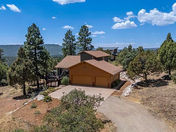 The great room’s wall of windows frames stunning mountain views, while southern exposure fills the space with natural light, seamlessly bringing the outdoors inside. Set on 3.5 acres of tall Ponderosa and Piñon pines, the property offers a private retreat with abundant wildlife and birdwatching opportunities, all just minutes from downtown Durango and Lake Nighthorse. The primary suite occupies the “top floor,” ensuring maximum privacy. Its luxurious bath features a soaking tub, rainfall shower, and LED-lit mirror for ambient lighting. Dual walk-in closets add both function and convenience. Engineered walnut flooring runs throughout the main level, adding warmth and style, while radiant in-floor heating on every level ensures year-round comfort. A gas log fireplace enhances the cozy ambiance. The walk-out lower level features a spacious bonus area, perfect for movie nights, entertaining guests, creative projects, or simply relaxing. Updates include the roof, windows, stucco, corrugated steel accents, flooring in the lower level, and a remodeled primary bath, giving the home a refreshed, modern look. Completing the property is a three-car garage and a large parking pad with ample room for a boat or recreational vehicles.