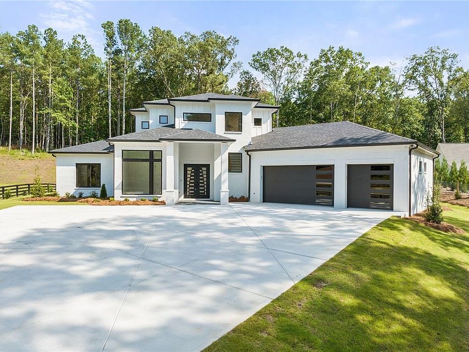 Elegant and inviting, this modern contemporary farmhouse is situated on 1.84 acres of lush land, fully fenced with a privacy gate that welcomes you into your own private sanctuary. As you enter through the two-story grand entryway, you are immediately captivated by the open concept design that seamlessly blends functionality with style. The main floor boasts a luxurious primary suite adorned with timeless finishes in the en-suite bathroom, featuring a soaking tub, an oversized frameless shower and sizeable closet that conveniently connects to the mudroom and laundry. Additionally, you will find 3 bedrooms on the main floor accompanied by 2 full bathrooms and 1 half bath. The gourmet chef's kitchen equipped with top-of-the-line stainless steel KitchenAid appliances, quartz countertops, and custom cabinetry. The oversized kitchen island serves as both a focal point and gathering place as it overlooks the stunning living room adorned with beamed ceilings and custom built-ins with fireplace. A wet bar adds an element of sophistication while the 15-foot glass door beckons you to step outside onto the expansive back covered patio complete with an outdoor fireplace and your own personal oasis within the private backyard offering plenty of room for a future pool with irrigation. Upstairs this home offers an additional bedroom, full bathroom, loft with great office area and an oversized second living room with coffered ceilings, built-ins and fireplace. This home offers beautiful white oak true hardwoods throughout, custom European windows, central vacuum system, tankless hot water heater, spray foam insulation, 3 car garage with epoxied floors and dog shower. This home is conveniently located near restaurants, shops, Mall of Georgia, Gwinnett Exchange with quick convent access to highway 85 and highway 985 and HWY 124.
