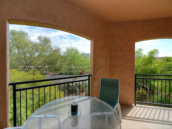 FANTASTIC MTN AND VERDANT TREE VIEWS from this gated, turn-key condo in quiet location. Lightly used by seasonal owner. High ceilings, stylish lighting, attractive tile and neutral carpets and paint. Split floor plan w/ foyer. Superb, airy great rm & dining area adjoining 2 covered, private balconies, each with mtn and tree views. Double doors reveal the wonderful master suite w/balcony, walk-in closet, & 2nd closet for abundant storage. Large kitchen with breakfast nook and full pantry. This beautiful tree-lined community includes barbeques & a sparkling heated pool & spa. Premier community in North Scottsdale, adjacent to DC Ranch & McDowell Mtn Ranch, only minutes from Westworld, Ice Den, TPC, shopping, golfing, dining, hiking trails, access to I-101, and MUCH more!