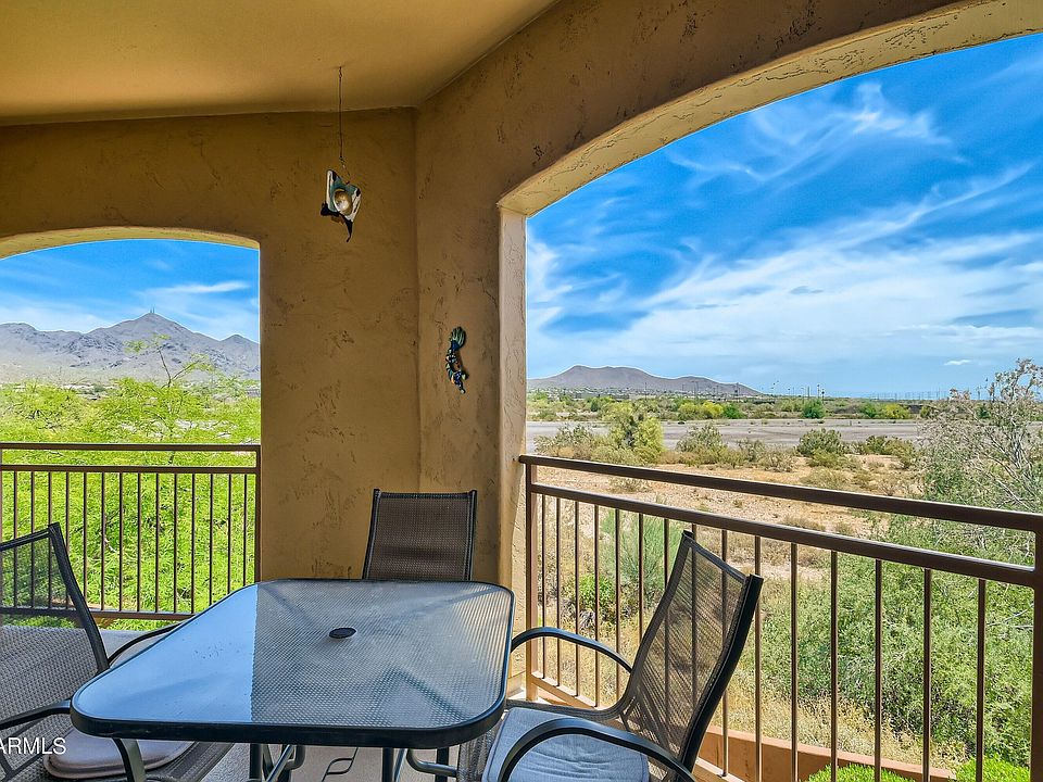 Favorite floor plan in this area! Rare three bedroom condo with mountain views! Gated community. Spacious open floor plan has two split bedrooms plus a den, large enough to double as a third bedroom or perfect for a home office. Large kitchen with pantry plus space for small dining table. This home has two large covered balconies with stunning views of the McDowell Mountains. Private location within the complex. Salida del Sol is known as a ''Boutique'' community with heated pool and spa. Easy 101 access. Walk to the Ice Den and WestWorld. Also close to TPC! All furnishings are included--move in and enjoy!