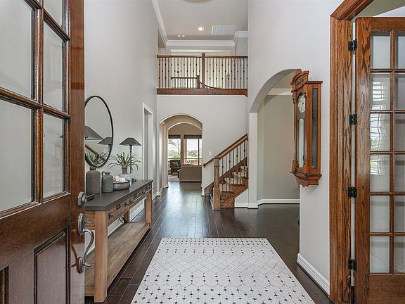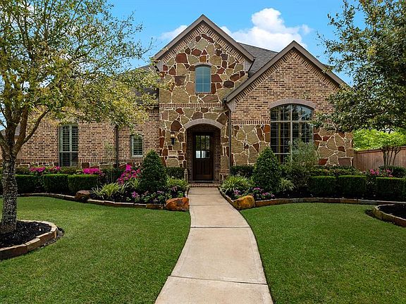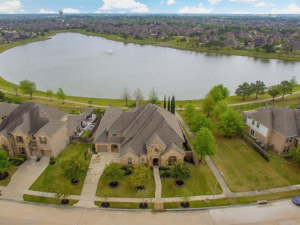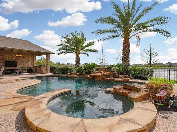 Take in the exquisite details of this showcase home on the lake. The sweeping waterfront lot offers breathtaking views of the sunrise over the lake, which can be enjoyed from the beautifully landscaped backyard featuring 2 covered patios, outdoor kitchen perfect for al fresco dining year-round, pool, spa, and fire pit. Property features sumptuous wood flooring, formal dining room, study with French doors and built-ins, living room with a stone fireplace and towering windows, game room with bonus card room, home theater with tiered seating, covered balcony with stunning panoramic views, and an oversized 3-car garage. The gourmet island kitchen boasts high-end granite countertops, tile backsplash, double oven, and breakfast room. Escape to the private master suite with a sitting room, spacious walk-in closet, separate vanities, jetted tub, and shower. Only steps away from the dog park and walking trails around the lake. Zoned to highly acclaimed schools in CFISD. LOW PROPERTY TAXES.