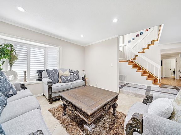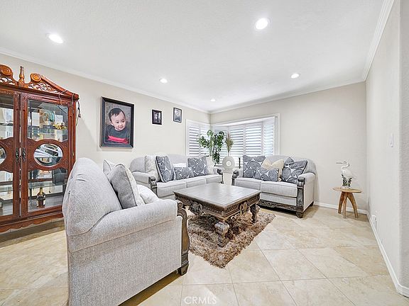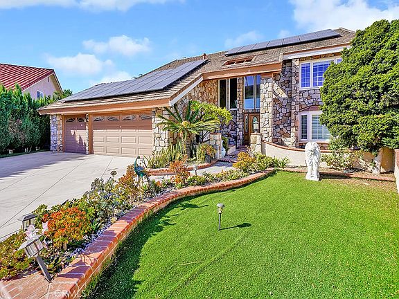 Rare Find in the heart of Fountain Valley. This lovely home boasts two primary suites, one upstairs and one downstairs, nestled in a peaceful interior cul-de-sac location. It features a spacious three-car garage, a tile roof, and eco-friendly solar panels that are paid off. From the moment you enter through the custom wood door with leaded glass inlays, you'll notice the and the elegant stone and wood flooring. Crown molding, bullnose corners, dual-pane windows, and mirrored wardrobes adorn every corner. The living room features a charming front bay window, while the adjacent formal dining area showcases a custom chandelier.