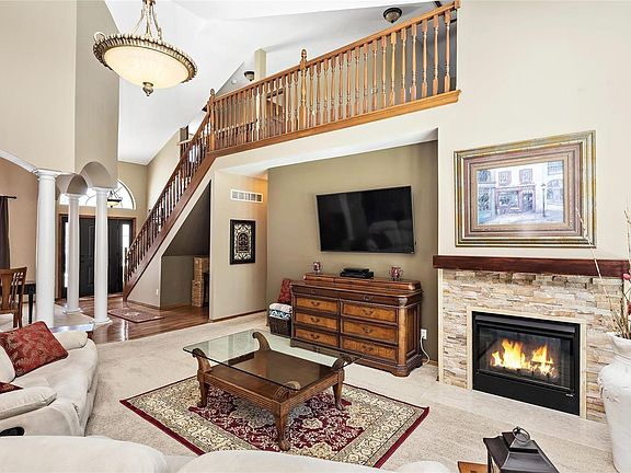 Stunning Atrium 1.5 Story w/cathedral ceilings in the grea rm & kitchen provide a dramatic entrance & natural light into this open floor plan. Kit features center island, walk-in pantry, wet bar w/millwork & ss appliances. Powder rm recently updated w/marble floor, fixtures & vanity w/granite counter. Formal DR outlined by pillars leads to spacious greatrm w/gas FP w/custom stone accents. 1st floor master bdrm w/his/her walk-in closets, Gas FP, & en suite bathrm, sep tub/shower & double vanities. 2nd floor has 2 more bdrms, renovated Jack & Jill bath w/ceramic fl, tile backsplash & new vanity. Fin LL w/9 pour boasts theater rm (seller willing to leave chairs & some equipment), gas FP, 4th bdrm, full bath, kitchen/entertaining area, & lots of storage. Other features include Pergola, landscaping & fire pit, 7-zone irrigation system, mn flr laundry, 3 car garage. See SD for even more updates! Seller will offer a $2,000 closing cost credit toward refinishing of wood floors on main level.