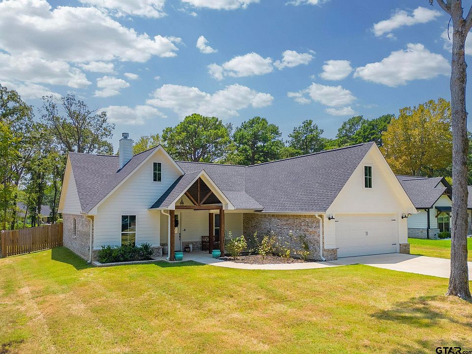 2021 Construction Farmhouse at Lake Tyler East ! As soon you enter the front door, under the covered front porch, the great room with vaulted ceiling, custom built-ins, fireplace, bright windows, and open concept to the kitchen will greet you at the door. Off the great room, the covered patio allows you to entertain outdoors, and wooden fence has gate that opens up to the remaining property. The kitchen features dining area, leather pearl granite countertops, island with sink overlooking the great room, and loads of cabinet space, and large pantry. Primary bedroom with tray ceilings has private bathroom that is separate from the two additional bedrooms and guest bathroom. Primary bathroom features double vanities, large shower, separate tub and closet that connects to the laundry room. The only thing that is missing to make this house a home is YOU!
