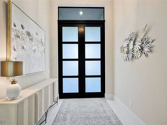 Welcome to this exquisite designer-decorated and fully furnished residence located within the prestigious Cape Royal Golf & Country Club. Cape Coral’s premier gated golf community offering 27 holes of championship golf, low HOA fees, and no mandatory golf membership. From the moment you enter, this home delivers the “wow” factor with stunning attention to detail and timeless elegance throughout. Travertine tile flooring flows seamlessly through the main living areas, while soaring ceilings, custom millwork, and curated finishes create a sense of refined sophistication. The gourmet kitchen is a chef’s dream, featuring a large center island, high-end Dacor appliances, custom cabinetry, and a gas cooktop—perfect for entertaining or intimate evenings at home. The open floor plan connects the kitchen, dining, and living spaces effortlessly, with 90-degree disappearing sliders that extend the living area to the lanai, capturing panoramic golf course views and bringing the outdoors in. The living room offers a coffered ceiling, an elegant electric fireplace, and designer lighting that adds warmth and character. The formal dining area is enhanced by a tongue-and-groove ceiling and decorative lighting, creating the perfect setting for unforgettable dinners and celebrations. The luxurious primary suite is a private sanctuary featuring a tray ceiling, plantation shutters, rich wood flooring, and direct access to the lanai. The spa-inspired primary bath offers dual vanities—one with a dedicated makeup station—a large soaking tub, and an oversized walk-in shower with dual shower heads. The split-bedroom floor plan ensures privacy for guests, and each guest bath has been thoughtfully designed with high-end finishes and tasteful decor. Step outside to your private resort-style lanai, where relaxation and entertainment meet in perfect harmony. The extended under-truss seating area boasts a tongue-and-groove ceiling, decorative ceiling fans, and a full summer kitchen with a built-in gas grill—ideal for outdoor dining and gatherings. The electric-heated saltwater pool features a sun shelf and a large spa, inviting you to unwind while enjoying the serene golf course backdrop and stunning Florida sunsets.