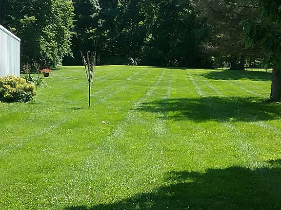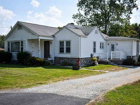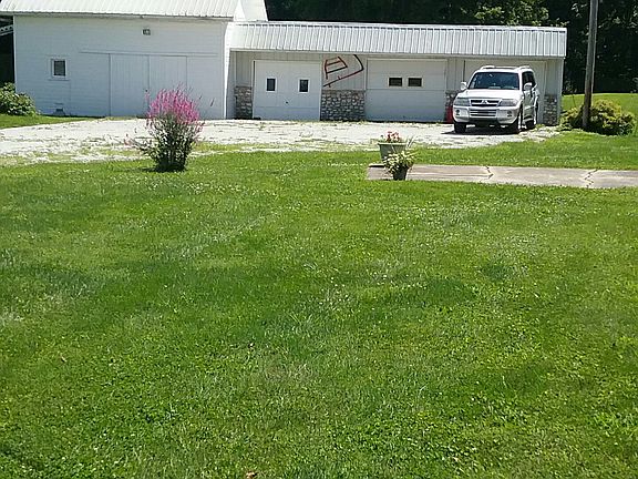 WOW! A very nice bungalow style home with nice applianced oak kitchen, formal dining area, large living room, 2 full baths and full basement sitting on 1.8 acres with woods and creek. All appliances remain. 3 car detached garage has attached barn with covered storage at end and rear of barn.