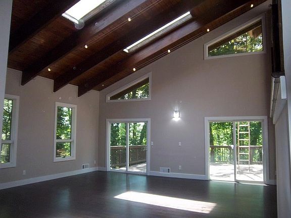 - Interior: 10 ft+ Ceil Main, Entrance Foyer, Hardwood Floors, Bookcases, His & Her Closets, Exposed Beams, Skylights
