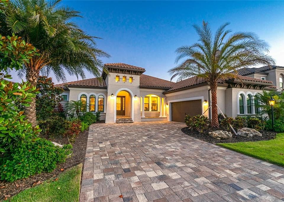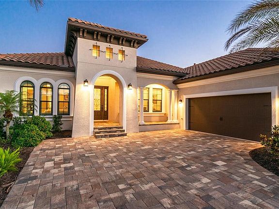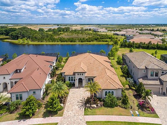 Nestled in the premier Country Club of Lakewood Ranch, this luxurious & supremely private three-bedroom home built in 2016 presents the ideal mix of space & style. Its 3,395 square feet of living area is smartly configured across one level, w/sweeping panoramic lake views, no homes in sight, & rear southern exposure that sets the scene for elegant entertaining or simply relaxing. Step inside to beautifully crafted spaces & marvelous appointments; exquisite travertine floors flow throughout the main living areas enhanced by crown molding, 5 ¼ baseboards, elegant light fixtures & fans, & plantation shutters. The gourmet kitchen is an alluring culinary centerpiece equipped w/stainless appliances including gas cooktop, center island, designer tile backsplash, lazy Susan, stainless-steel farm sink, breakfast bar, & casual dining nook that's perfect for morning coffee & croissants. Host elegant evenings in the spacious great room featuring soaring ceilings & gracious pocket slider that opens onto the covered lanai. All bedrooms boast engineered wood floors while the master suite includes suited walk-in closets, door to lanai, & bath w/granite surfaces & free-standing tub. Additional spaces include sizable bonus room, mud room, office, laundry room, & oversized two-car garage. Hurricane shutters provide peace of mind. Enjoy the outdoors from the expanded screened, travertine terrace w/heated salt-water pool & spa and fully equipped summer kitchen for entertaining in Florida style.
