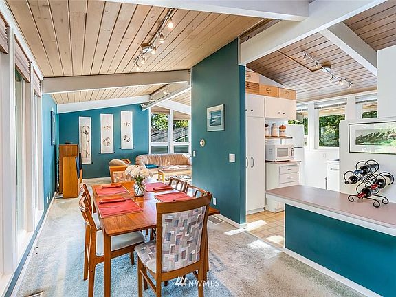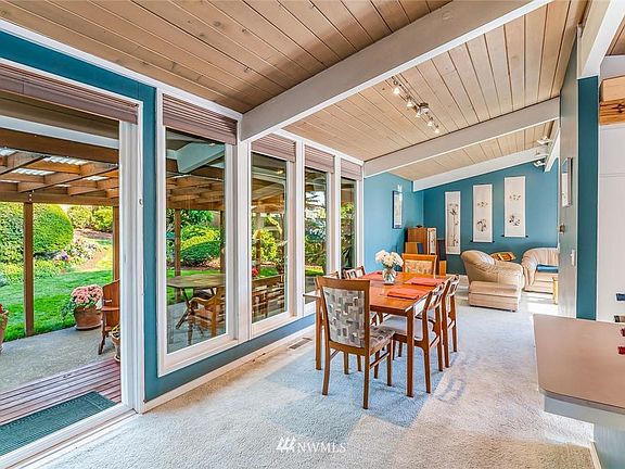 Immaculately maintained Mid-Century home in desirable Three Tree Point community. Many updates/new: PVC roof, 30 windows, appliances, covered patio & more. Open-concept kitchen & dining w/ floor-to-ceiling windows to backyard. Great floor plan & vaulted ceilings! Lower level daylight basement family room features 2nd fireplace. Large 2+ car garage w/deck above. Beautiful mature landscaped yard. Great location- scenic walk to public beach and trail. 200 sq ft attached studio w/utils not counted.