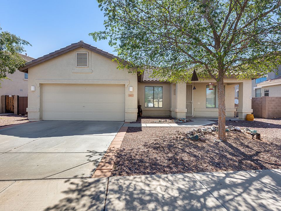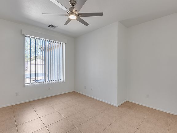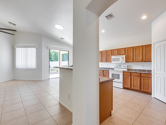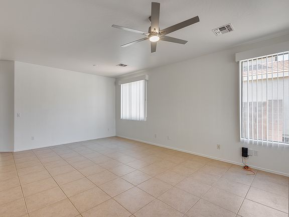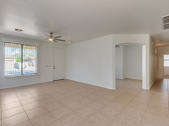 Light, bright and move-in ready! This charming single-level home offers fantastic curb appeal with a shaded front porch, low-maintenance desert landscaping, and a wide 2-car driveway. Inside, soaring ceilings and neutral tile floors carry through the main living spaces for an open, airy feel. Off the entry you'll find a flexible front room perfect as a formal living area, home office or playroom leading to the spacious great room that flows seamlessly to the kitchen and dining.