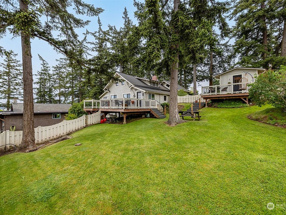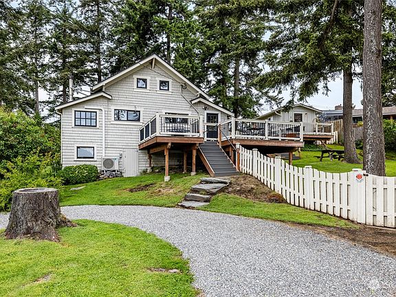 Discover a rare fee simple gem in LaConner with stunning bay views. This charming home features a main floor master suite for ultimate convenience, while the upper level offers two additional bedrooms, half bath and a versatile bonus room, ideal for guests. Inside, you'll find beautiful hardwood floors and the cozy ambiance of a wood-burning stove. Enjoy a spacious updated kitchen w/newer appliances and updated baths on both levels. The home opens up to two large new decks (hello summer), perfect for entertaining or enjoying peaceful moments surrounded by gorgeous landscaping as well as a detached studio perfect for guests, a home office, or a creative space. The property includes access to the use of Hope Island amenities.