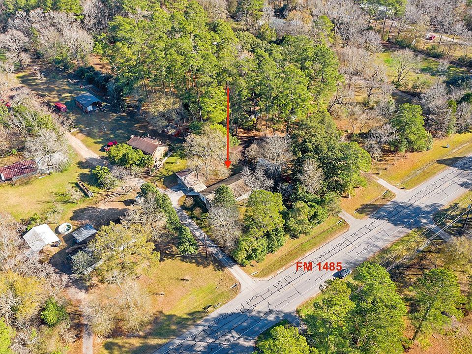 Charming single-story home with a prime location off of FM 1485 within close proximity to 242 and Hwy 59! Located on a nearly sprawling 1/2 acre, do whatever your heart desires on this unrestricted piece of property. Surrounded in trees, the front entry welcomes you to the spacious foyer and living room with soaring vaulted ceilings and custom stone wood-burning fireplace with built-ins. Light and bright breakfast room with laminate wood flooring open to kitchen featuring breakfast bar, extensive counter space and scenic window to look out of while washing dishes. Master suite with dual sinks, and walk in shower. Large secondary bedrooms, one with a walk-in closet! French door access to carport and backyard with fenced off area perfect for pets. New well installed 2020, approximately 10 year old Ondura roof and NEVER flooded! This well maintained home is ready for you to add your personal touch.
