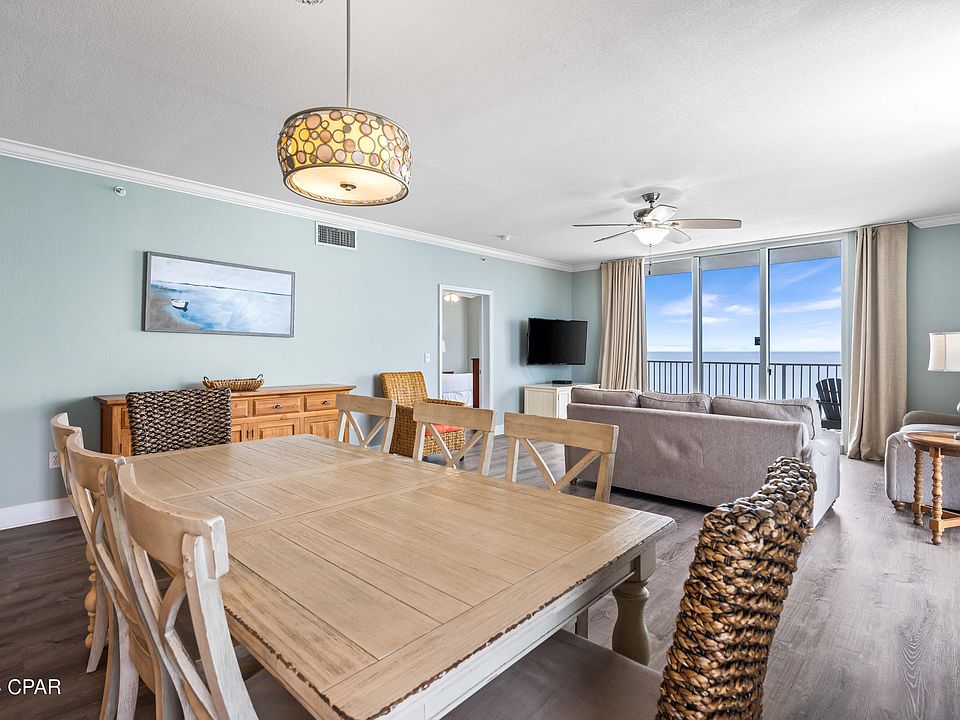 This 3 bedroom plus bonus bunk room, 3 bath unit is situated perfectly on the western corner of Tidewater Beach Resort in Panama City Beach. The resort sits directly on the beach with expansive views of the Gulf's pristine beaches, it offers almost 2,300 sq.ft of living space. The three large bedrooms include a beachfront master with balcony access, and a bonus 4th space configured as a bunk room serving as an additional bedroom. The oversized kitchen seamlessly connects to the living and dining area, featuring new stainless appliances, granite countertops, enhanced lighting, and ample seating at the breakfast bar. The wraparound balcony is a highlight, ensuring you never miss a sunset in this coastal paradise. Rental ready with a great history!