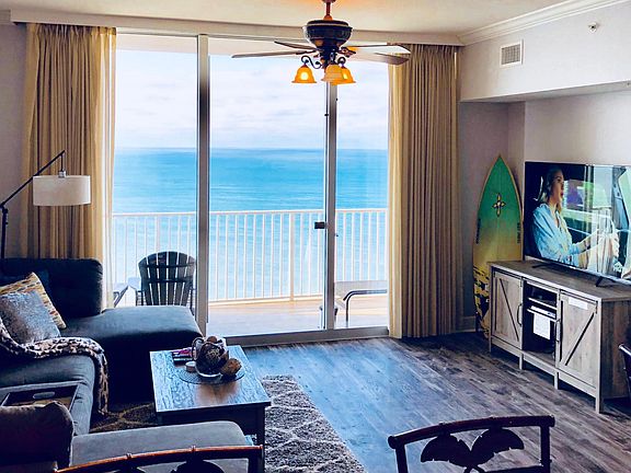 SPECTACULAR GULF-FRONT MASTER PENTHOUSE level Available for MONTHLY SEASONAL rental fall and winter(not Available for long term or annual lease). Amazing direct waterfront views from 30 ft wide 160 sqft of PRIVATE balcony accessible from master bedroom and living area! 65" UHD TV plus 43" HD in Master, tastefully decorated with Beachy feel fresh updates, this very comfortable getaway has 10' tall sliders to view the Emerald Coast-pictures can't do justice. Private bunk room. New queen sleeper. 636' of gulf frontage beach and every amenity you want. Located near Pier Park. Close proximity to the airport. It's perfect! Incredible PENTHOUSE views right on your 30' wide 160 sqft PRIVATE balcony (One of the largest in PCB)! Watch the Rays and the Dolphins with your morning coffee as the Pelicans fly by and the Osprey dive for breakfast. During the day, take one of the 7 elevators down and enjoy the sugar white sands of the emerald coast as you sunbathe and read, play in the warm calm Gulf waters, or for the more adventurous, rent jetskis right on your own beach. If swimming in the gulf is not your thing, choose from either of two 4000+ sqft pools each with its own outdoor Jacuzzi - there's even a kiddie pool for the little ones. If you'd rather swim inside, enjoy the large indoor pool. Then head to the Fully equipped and spacious gym and workout as you look over the gulf. After you've worked out the stress, head to the Roman spa to work out the kinks! 2 large Jacuzzis, plus separate men's and women's sauna and steam rooms with private showers and lockers. Then head back to the Penthouse level to watch the sunset with a glass of wine on your own private balcony! Make sure you bring your camera because you'll want to post the pictures and drive all your friends crazy. After all that, head to the private theater for free movies or just stay in and watch your own on the 65" 4K UHD equipped with an Apple TV right in your own living room! The Tidewater has every amenity you could imagine and is within walking distance to the fabulous PIER PARK with its shops, restaurants, and amusements. There is also a concert venue right there and they even have regular fireworks displays that can be seen from the front of the Tidewater building (search PCB events for dates and times of fireworks, concerts and other events). There is an on resort restaurant and bar as well as a poolside snack-shack and bar. "Flip-Flops" serves STARBUCKS coffee creations an has hand scooped ice cream as well as drinks and souvenirs. There are too many restaurants to name within a 5 minute drive and over 20 within walking distance. The Airport is an easy 15 minute drive and it's very easy to find your way. The Condo's kitchen is fully stocked for any type of cooking if you choose to make your own meals. There is a microwave, side-by-side fridge with icemaker and water in the door, dishwasher, garbage disposal, and electric range/oven. There is a coffee maker and a blender for your beverage making needs. there's even a crock pot so you can start it in the morning and leave for the beach and come home to a finished meal. (yes, we are that lazy too) There is also a washer and dryer in unit so no quarters are needed! so book it and bring your stuff . . . This is a true vacation you'll reminisce about for years!