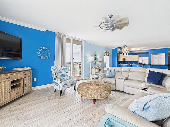Very special low floor unit which is much in demand by owners and guests. This is the largest unit at Tidewater and features gulf and sunset views from the wrap around balcony. This three bedroom,three bath unit featuring a large bunk room/office with full bunks. The contemporary and soothing blue and beige color scheme and furnishings will spell home to you and your family. This is a must see if you are looking for space and comfort and is a proven rental machine.